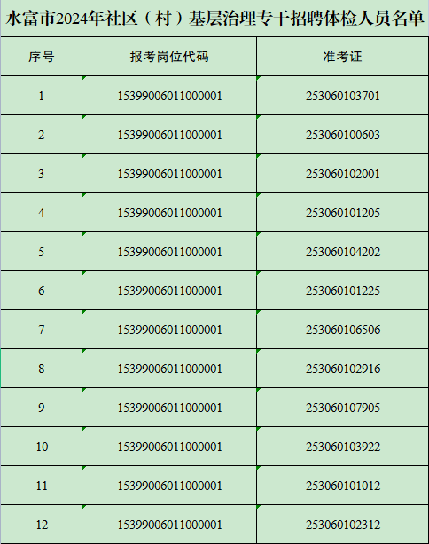 根據(jù)云南省2024年社區(qū)(村)基層治理專干招聘工作有關(guān)要求,經(jīng)資格復(fù)審,現(xiàn)將水富市2024年社區(qū)(村)基層治理專干招聘體檢有關(guān)事宜公告如下: