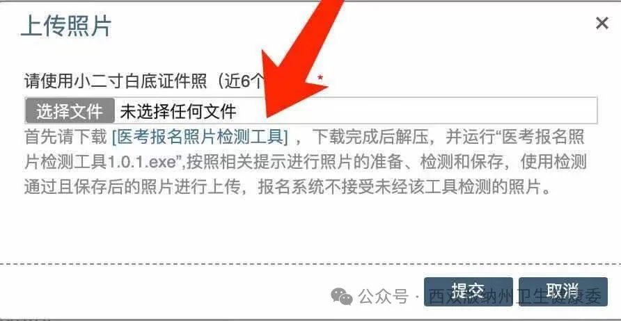 (四)報名照片:考生網(wǎng)上報名前,先按要求準備近期6個月內(nèi)正面免冠小2寸白底證件數(shù)碼彩色證件照(照片必須清晰,亮度足夠,頭像占照片的2/3,露眉露耳,jpg/jpeg格式)。需按照系統(tǒng)提示內(nèi)容下載并運行“醫(yī)考報名照片檢測工具”(如圖),網(wǎng)報系統(tǒng)只接受經(jīng)該工具檢測通過且保存后的照片進行上傳,照片不符合要求的,不予進行資格審核。請廣大考生提前準備,以免影響考試報名。