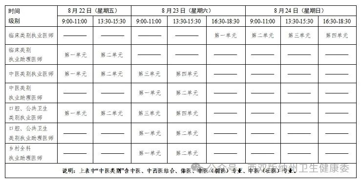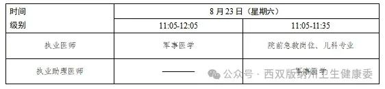 考試實行計算機化考試(含傣醫(yī)類別),軍隊現(xiàn)役人員加試軍事醫(yī)學(xué)專業(yè)考試,申請參加短線醫(yī)學(xué)加試科目的考生參加院前急救崗位和兒科專業(yè)加試相應(yīng)內(nèi)容。統(tǒng)一考試時間如下: