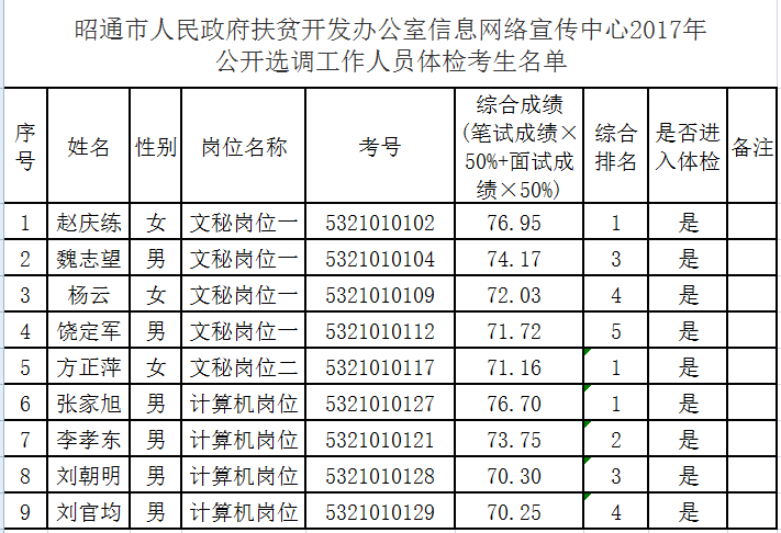 昭通市扶貧辦信息網絡宣傳中心2017年公開選調工作人員通過筆試、面試、考察等程序,已進入體檢階段,現(xiàn)將體檢相關工作及體檢人員名單通告如下: