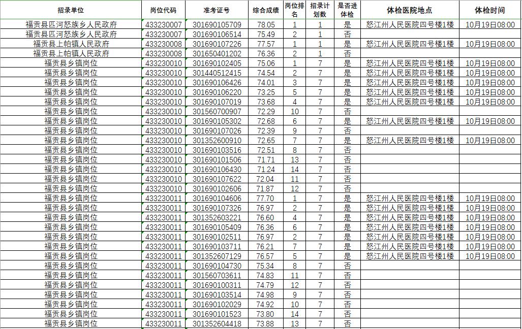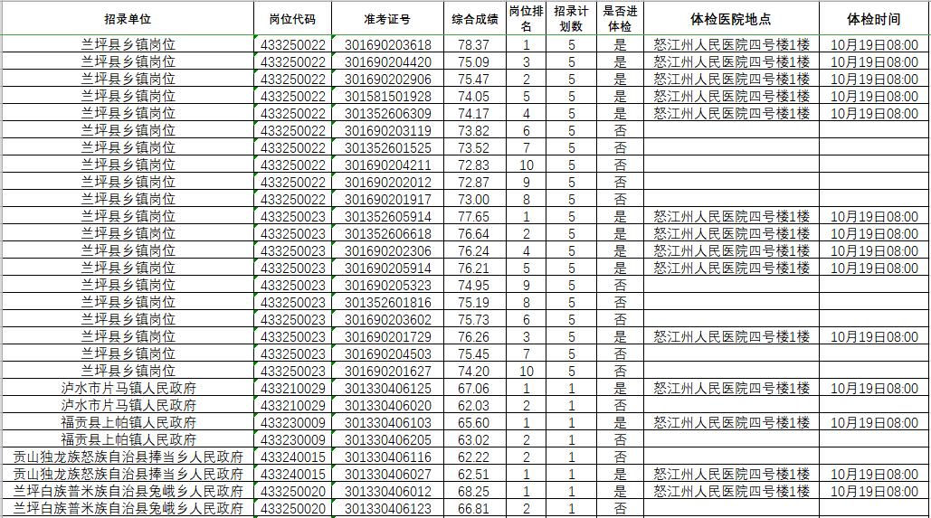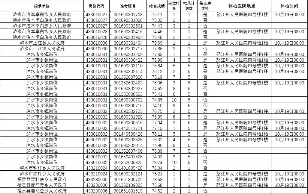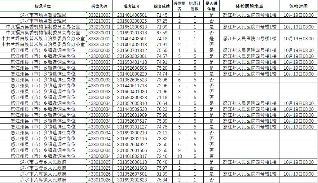 根據(jù)《云南省2020年度考試錄用公務(wù)員公告》安排,按照《怒江州2020年度考試錄用公務(wù)員面試及后續(xù)工作公告》,現(xiàn)將考生綜合成績及進(jìn)入體檢人員名單公示如下,并請進(jìn)入體檢環(huán)節(jié)考生按時參加體檢。