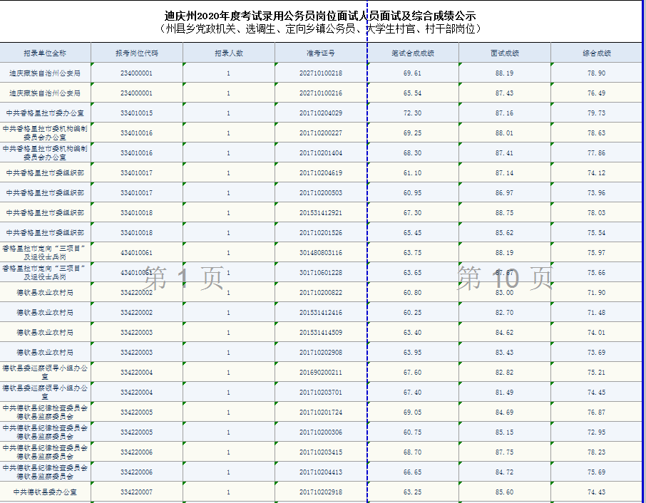 迪慶州2020年度考試錄用公務(wù)員(州縣鄉(xiāng)黨政機(jī)關(guān)、選調(diào)生、定向鄉(xiāng)鎮(zhèn)公務(wù)員崗位)面試工作已于2020年10月 17日、18日在中共香格里拉市委黨校順利實(shí)施,現(xiàn)將面試人員面試及綜合成績公示如下,公示期2020年10月19日—2020年10月26日。若報(bào)考者對(duì)以上公示成績存在疑問,可于2020年10月26日前到中共迪慶州委組織部公務(wù)員一科查詢(聯(lián)系電話:0887—8826105)