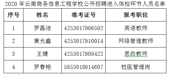 按照《云南商務(wù)信息工程學(xué)校2020年事業(yè)單位公開招聘工作人員公告》招聘程序,經(jīng)筆試、資格復(fù)審、面試后,根據(jù)綜合成績排名情況,按招聘人數(shù)與體檢人數(shù)1:1的比例確定參加體檢人員共4人?,F(xiàn)將進(jìn)入體檢環(huán)節(jié)的人員名單及后續(xù)工作公告如下: