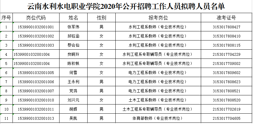 云南水利水電職業(yè)學院2020年公開招聘工作人員擬聘人員公示