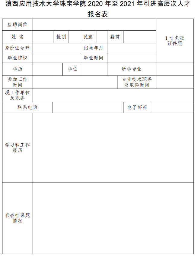 1.報(bào)名方式:報(bào)名采取網(wǎng)絡(luò)報(bào)名的方式進(jìn)行,應(yīng)聘人員需填寫《滇西應(yīng)用技術(shù)大學(xué)珠寶學(xué)院2020至2021年引進(jìn)高層次人才報(bào)名表》(附件),連同身份證、學(xué)歷學(xué)位證(留學(xué)回國人員須提供教育部認(rèn)證的材料)、職稱證或職業(yè)(執(zhí)業(yè))資格證、代表性學(xué)術(shù)成果等發(fā)送至學(xué)院人事處郵箱(郵箱地址:zbxyrc5159339@163.com)進(jìn)行報(bào)名(郵件主題統(tǒng)一命名為姓名+應(yīng)聘崗位名稱)。