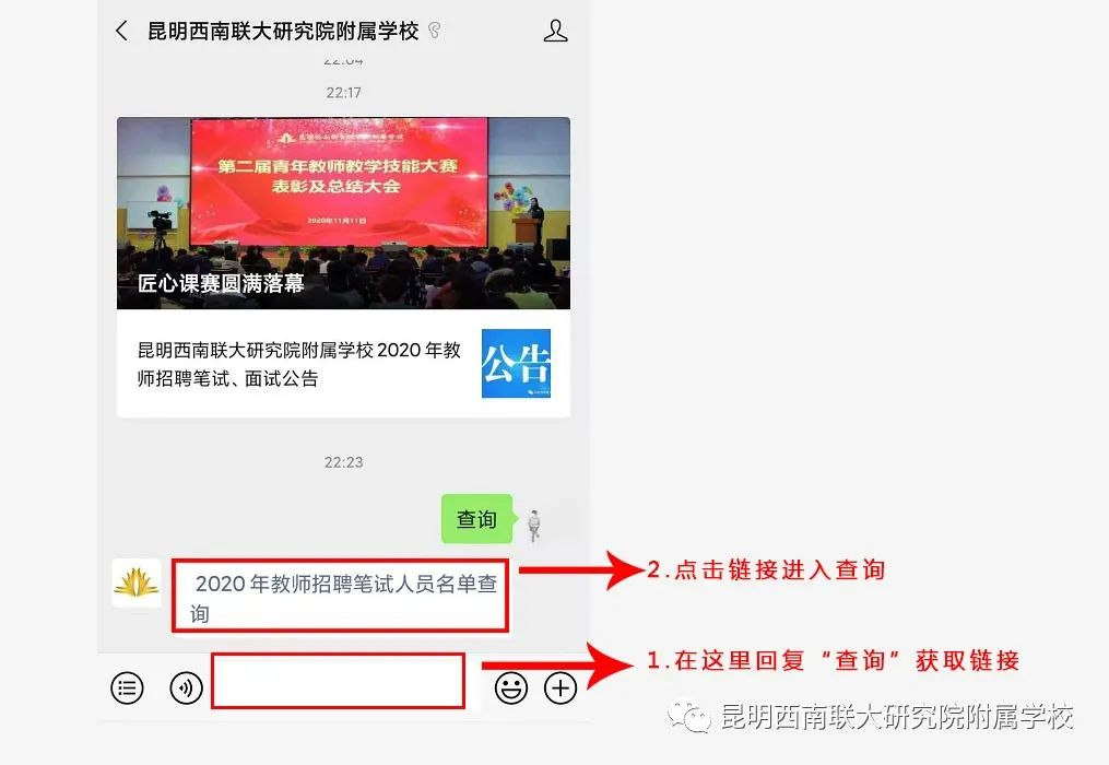 請應(yīng)聘者掃描公告下方二維碼關(guān)注我校官方微信(官方微信平臺(tái)“西南聯(lián)大研究院附屬學(xué)校”ID:kmxlschool),在學(xué)校微信公眾平臺(tái)對話窗口頁面回復(fù)“查詢”獲取查詢鏈接,打開鏈接輸入身份證號碼和姓名可查詢是否進(jìn)入筆試環(huán)節(jié),查詢時(shí)間:2020年11月12日至2020年11月14日。同時(shí),入圍筆試者將會(huì)收到學(xué)校發(fā)送的手機(jī)短信(無需回復(fù)短信),敬請留意!