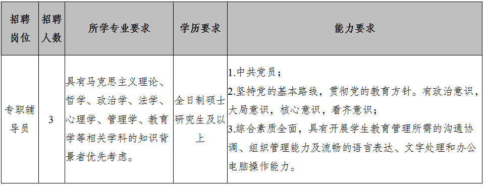 為適應學校發(fā)展的需要,需面向社會誠聘3名專職輔導員,現(xiàn)將有關(guān)事項公告如下: