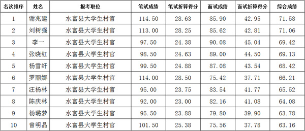根據(jù)昭通市委組織部《關(guān)于做好2014年大學(xué)生村官選聘面試等有關(guān)工作的通知》(昭組電明〔2014〕10號(hào))文件精神,現(xiàn)將水富縣2014年大學(xué)生村官選聘綜合成績(jī)予以公告。