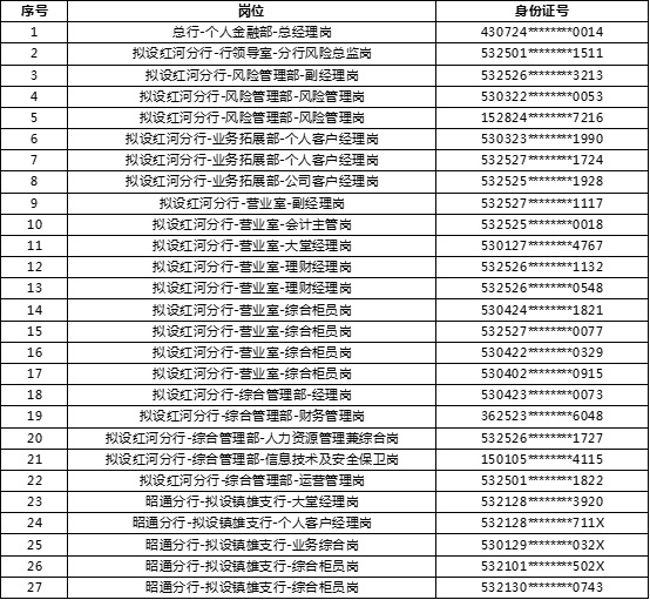云南紅塔銀行2020年新設(shè)機(jī)構(gòu)及總行部分管理人員社會(huì)招聘考試已結(jié)束,現(xiàn)將入圍人員名單公告如下: