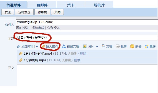 開始考試前,考生手持身份證于胸前置于鏡頭內(nèi)、身份證信息和頭像清晰可見,報(bào)告自己的姓名及考號(hào)、報(bào)考專業(yè)。服裝方面要求穿著運(yùn)動(dòng)服,款式和顏色不限。視頻當(dāng)中必須同時(shí)出現(xiàn)考生本人及秒表計(jì)時(shí)器(可用手機(jī)或秒表計(jì)時(shí))。每段視頻長(zhǎng)度控制在1.5分鐘以內(nèi),文件小于50M,文件格式為MP4,視頻分辨率不低于960*544,兩個(gè)視頻文件分別命名為:1分鐘跳繩、1分鐘仰臥起坐(先后順序不限)。視頻文件一律采用QQ郵箱超大附件模式發(fā)送,視頻錄制現(xiàn)場(chǎng)要求安靜且采光良好,測(cè)試內(nèi)容的視頻必須完整,視頻不允許有剪輯或者修改等痕跡,要求一次錄制完成,考生可多次錄制,選取自己認(rèn)為最好的一次上傳郵件,發(fā)送視頻郵件地址為:ynnuzlg@vip.126.com
