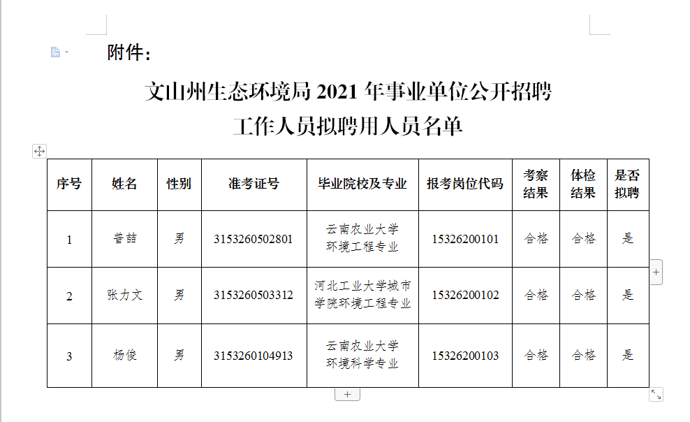 附件:文山州生態(tài)環(huán)境局2021年事業(yè)單位公開招聘工作人員擬聘用人員名單