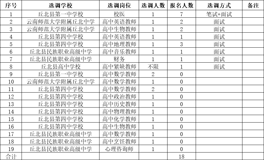 根據(jù)《丘北縣教體系統(tǒng)2021年公開選調(diào)高中在職在編人員方案》崗位設(shè)置,現(xiàn)將報名情況公示如下,請應(yīng)聘人員按時參加筆試、面試: