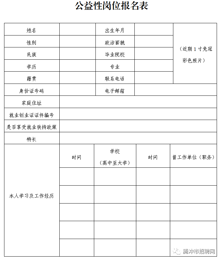3.報(bào)名地點(diǎn):騰沖市人力資源和社會(huì)保障局人力資源市場(chǎng)辦公室(騰沖市騰越街道山源社區(qū)文筆小區(qū)272號(hào)四樓)。