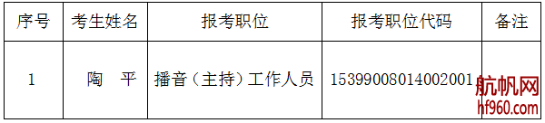 寧洱縣融媒體中心2021年特殊招聘播音(主持)工作人員招聘工作,經(jīng)發(fā)布公告、報(bào)名、資格復(fù)審、面試、考察、體檢程序,確定陶平為擬聘用人員?,F(xiàn)公示如下,公示時(shí)間從2021年9月6日起至9月14日止(共7個(gè)工作日),若信息有誤或?qū)M聘用人員有異議的,請(qǐng)與中共寧洱縣委組織部干部監(jiān)督科聯(lián)系。