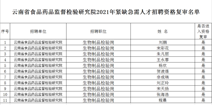 按照《云南省食品藥品監(jiān)督檢驗(yàn)研究院2021年緊缺急需人才招聘公告》中的招聘要求,我單位對(duì)報(bào)名人員材料進(jìn)行初審后,確定進(jìn)入資格復(fù)審人員名單,現(xiàn)將有關(guān)事宜通知如下: