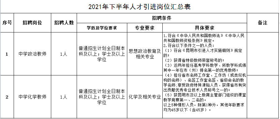 為加強(qiáng)學(xué)校教師隊(duì)伍建設(shè),引進(jìn)優(yōu)秀師資,進(jìn)一步滿足人民群眾對(duì)優(yōu)質(zhì)教育資源的需求,根據(jù)我校教育教學(xué)工作需要,面向社會(huì)引進(jìn)省內(nèi)、外優(yōu)秀中學(xué)政治教師1人、化學(xué)教師1人。通過人才引進(jìn)的教師解決編制,納入昆明市事業(yè)單位人員管理?,F(xiàn)將有關(guān)事項(xiàng)公告如下: