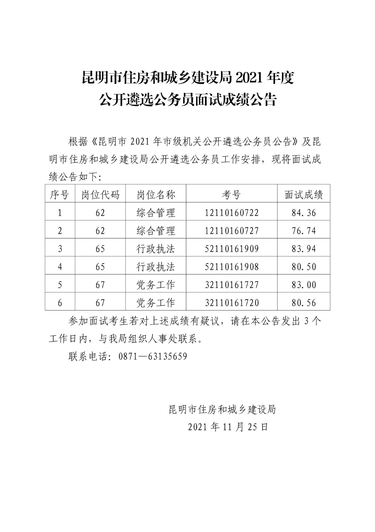 2021年昆明市住房和城鄉(xiāng)建設局遴選公務員面試成績公告