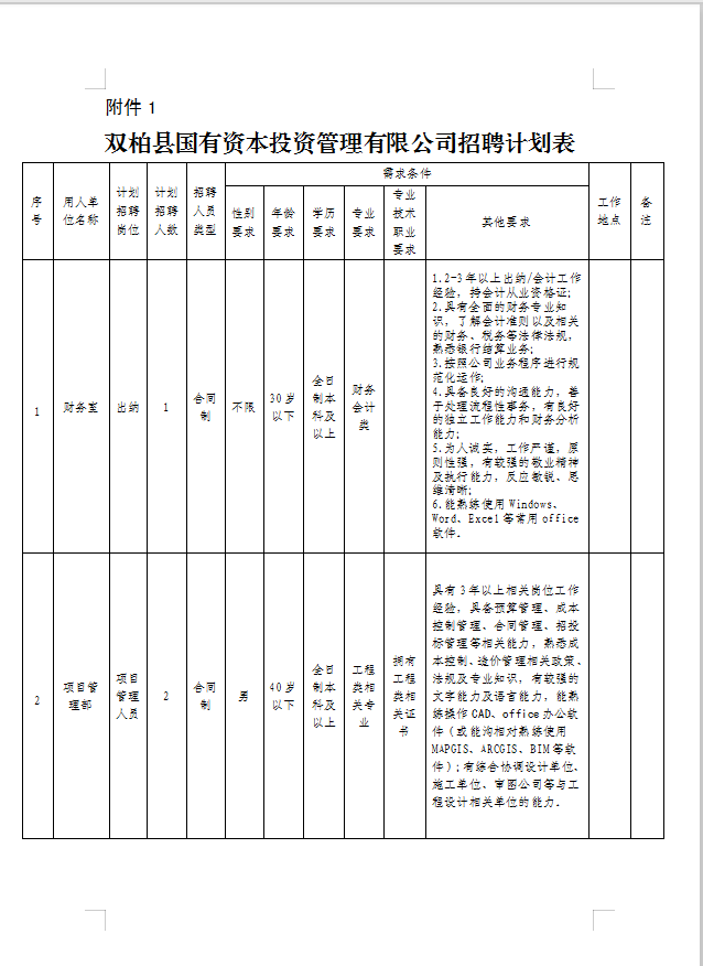 附件:1.雙柏縣國(guó)有資本投資管理有限公司招聘計(jì)劃表