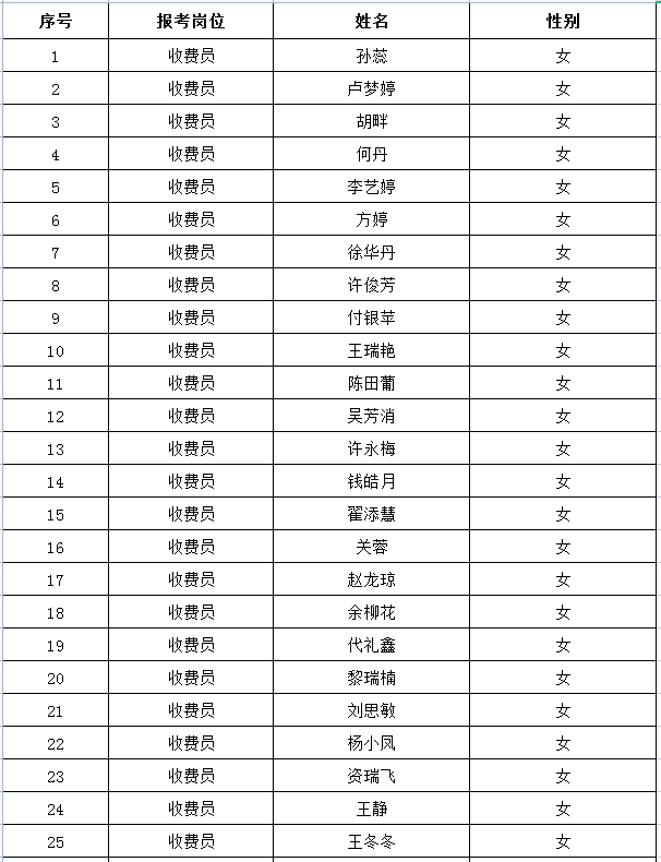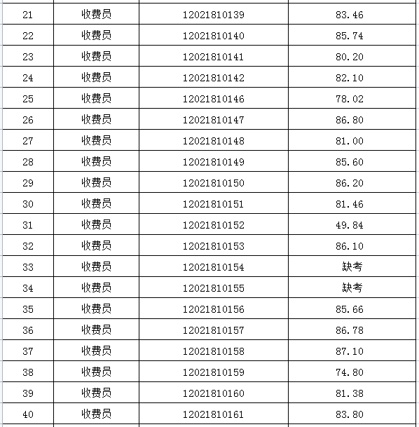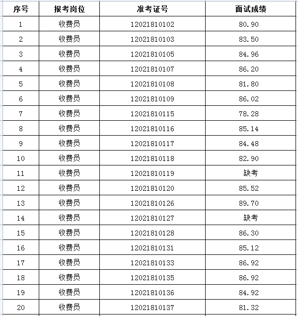 一、收費(fèi)員崗位面試成績(jī)