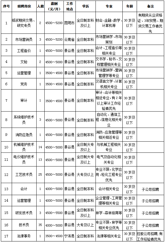 云南云景林紙股份有限公司招聘簡(jiǎn)章