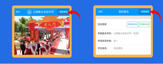 家長可以使用同一賬號給多個孩子預(yù)登記,按照登陸指引進(jìn)入報名首頁——點(diǎn)擊我的報名——點(diǎn)擊繼續(xù)報名。