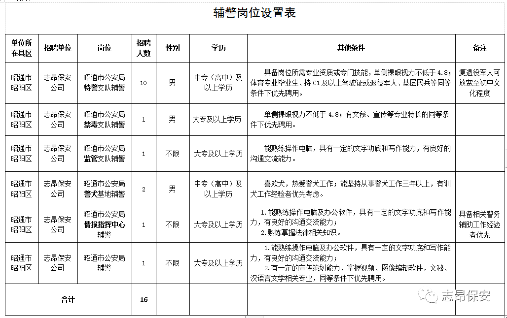 昭通志昂保安服務(wù)有限責(zé)任公司面向社會(huì)招聘工作人員,派遣至昭通市公安局從事警務(wù)輔助工作?,F(xiàn)將有關(guān)事項(xiàng)公告如下: