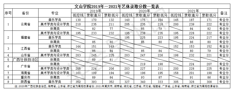 文山學(xué)院2019年—2021年藝體錄取分?jǐn)?shù)一覽表