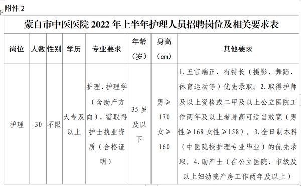 2.《蒙自市中醫(yī)醫(yī)院2022年上半年護(hù)理人員招聘崗位及相關(guān)要求表》