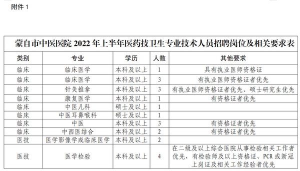 1.《蒙自市中醫(yī)醫(yī)院2022年上半年醫(yī)藥技衛(wèi)生專業(yè)技術(shù)人員招聘崗位及相關(guān)要求表》