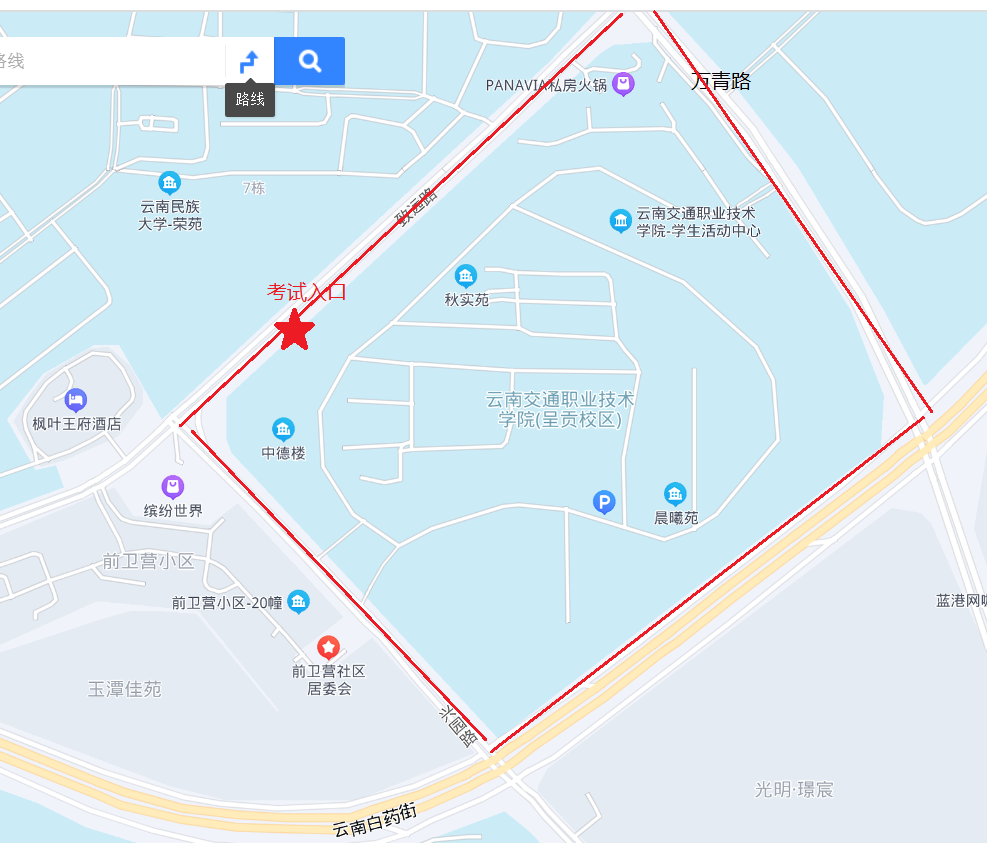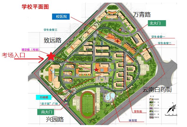 因疫情防控工作需要,考生請于云南交通職業(yè)技術(shù)學(xué)院致遠(yuǎn)路大門入校,車輛不得入校停放。6月25日7:00可以入校,8:00可以進(jìn)入博學(xué)樓考場,因入校需查驗(yàn)兩碼、核酸、體溫、身份證、準(zhǔn)考證,請考生預(yù)留足夠時(shí)間。具體考場路線見下圖:
