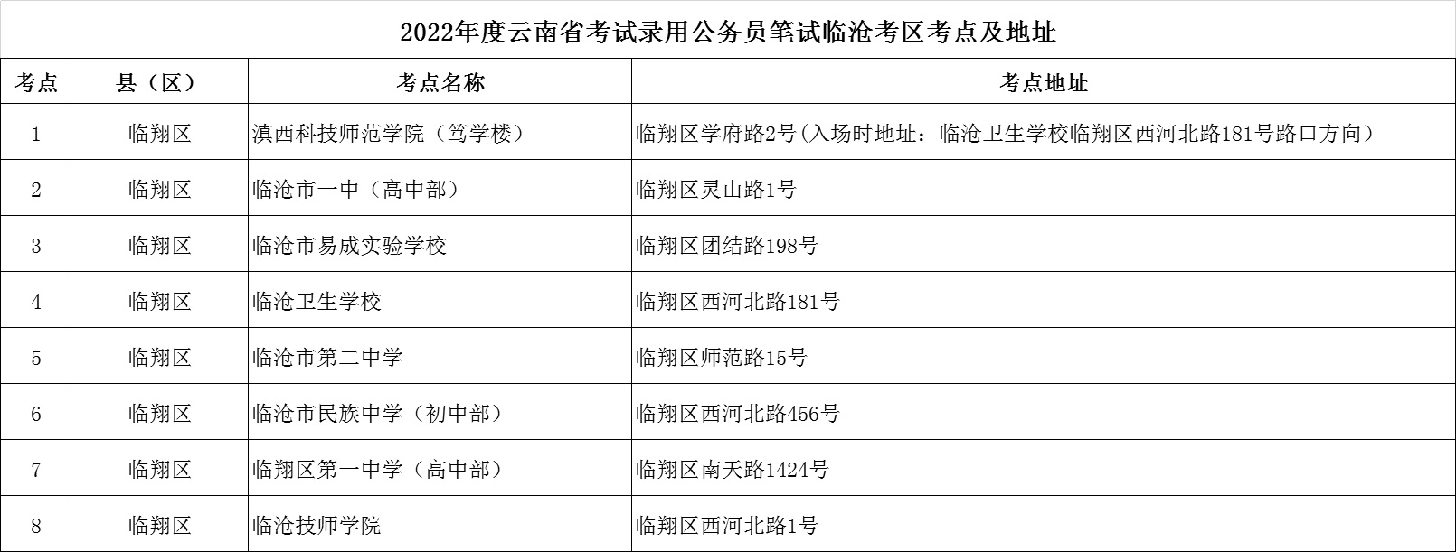 附件 2022年度云南省考試錄用公務(wù)員筆試臨滄考區(qū)考點及地址