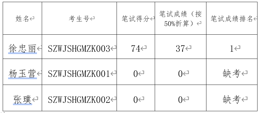 根據(jù)《師宗縣政務(wù)服務(wù)管理局關(guān)于公開招聘一名社會購買服務(wù)崗位(聘用人員)的公告》文件精神,經(jīng)公開發(fā)布招聘公告、報名、資格審核、筆試環(huán)節(jié),現(xiàn)將應(yīng)聘人員筆試成績情況公示如下: