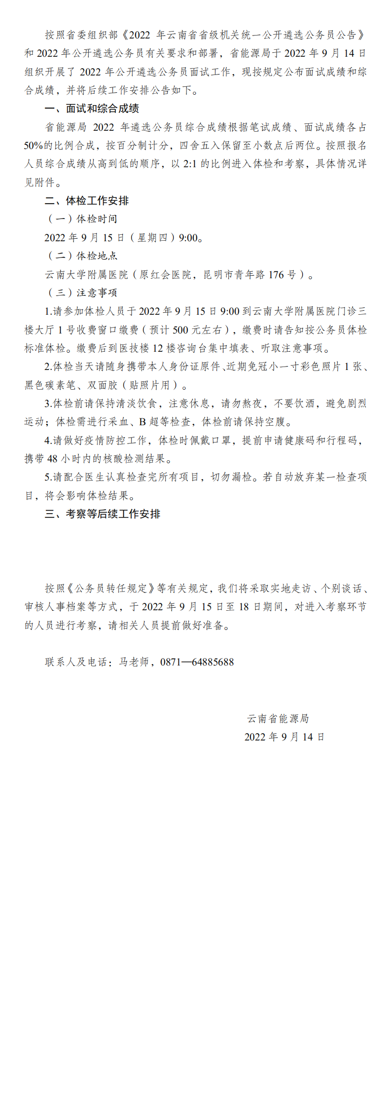 云南省能源局關(guān)于公布2022年公開遴選公務(wù)員 面試和綜合成績及體檢等有關(guān)事項的公告