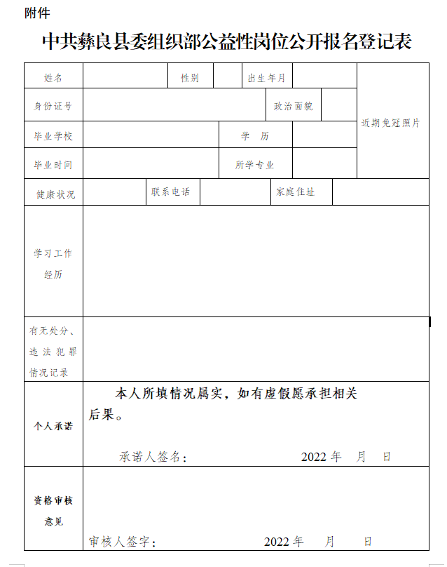 附件:中共彝良縣委組織部公益性崗位公開報名登記表