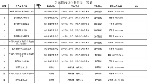 招聘具體事宜請(qǐng)咨詢用人單位。符合公益性崗位上崗條件的個(gè)人也可以到嵩明縣勞動(dòng)就業(yè)服務(wù)局綜合科申請(qǐng)公益性崗位求職登記,詳詢陳老師:0871-67917444。
