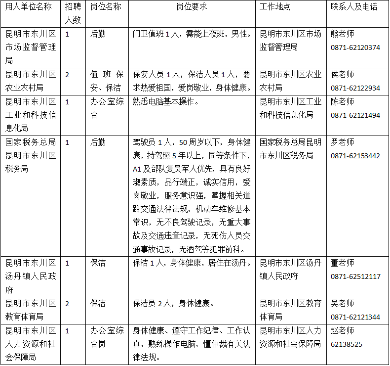 根據(jù)《昆明市人力資源社會保障局 昆明市財(cái)政局關(guān)于做好公益性崗位開發(fā)管理有關(guān)工作的通知》(昆人社通[2020])37號)文件精神,做好公益性崗位的開發(fā)管理工作,充分發(fā)揮公益性崗位“兜底線、救急難、促脫貧”的作用,因工作需要,現(xiàn)將昆明市東川區(qū)招聘公益性崗位工作人員有關(guān)事宜公告如下: