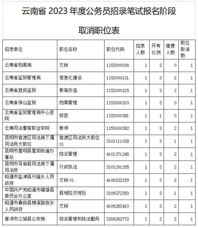 附件:1.云南省2023年度公務員招錄筆試報名階段取消職位表