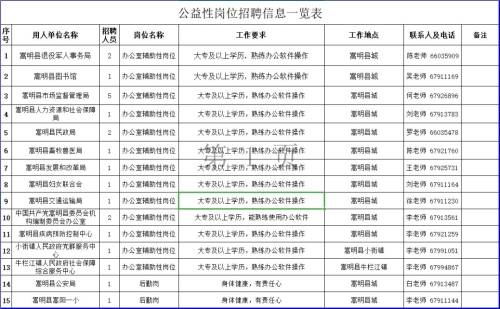 招聘具體事宜請(qǐng)咨詢用人單位。符合公益性崗位上崗條件的個(gè)人也可以到嵩明縣勞動(dòng)就業(yè)服務(wù)局綜合科申請(qǐng)公益性崗位求職登記,詳詢陳老師:0871-67917444。