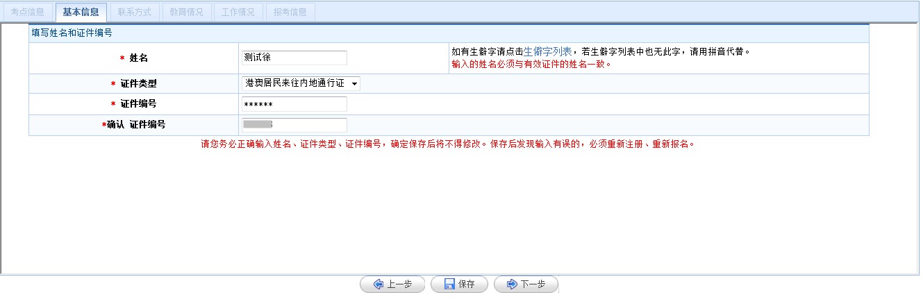 【填寫/修改報名信息】需要考生依次填寫“考點(diǎn)信息”、“基本信息”、“聯(lián)系方式”、“教育情況”、“工作情況”、“報考信息”六項(xiàng)內(nèi)容。