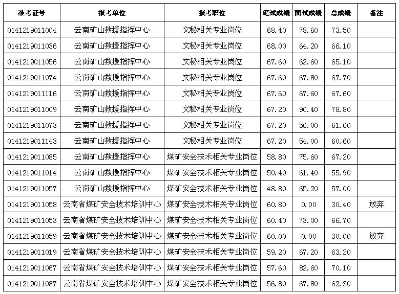 云南煤礦安全監(jiān)察局直屬事業(yè)單位2014年招聘人員綜合成績公告