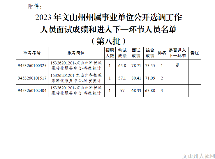 面試成績、綜合成績及進(jìn)入下一公開選調(diào)環(huán)節(jié)人員名單見附件《2023年文山州州屬事業(yè)單位公開選調(diào)工作人員面試成績和進(jìn)入下一環(huán)節(jié)人員名單(第八批)》。