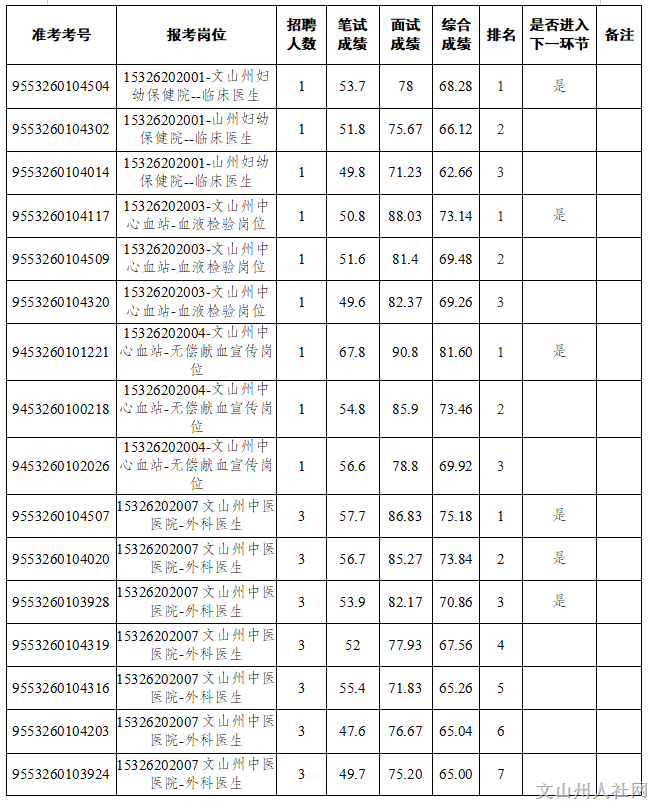 根據(jù)《2023年文山州州屬事業(yè)單位公開選調(diào)工作人員通告》和《2023年文山州州屬事業(yè)單位公開選調(diào)工作人員筆試成績(jī)及資格復(fù)審有關(guān)事項(xiàng)通告》要求,文山州衛(wèi)生健康委所屬事業(yè)單位州婦幼保健院、州中心血站、州中醫(yī)醫(yī)院于2023年7月18日、21日進(jìn)行了面試,現(xiàn)將面試成績(jī)和后續(xù)有關(guān)事項(xiàng)通告如下。