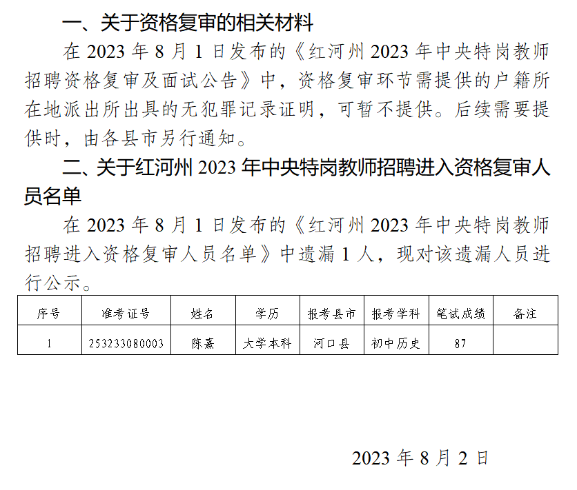 紅河州2023年中央特崗教師招聘資格復(fù)審及面試補(bǔ)充公告