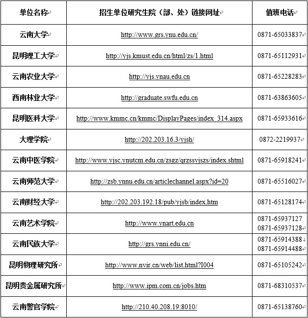 2015年云南省碩士研究生招生單位成績(jī)復(fù)核期間聯(lián)系方式