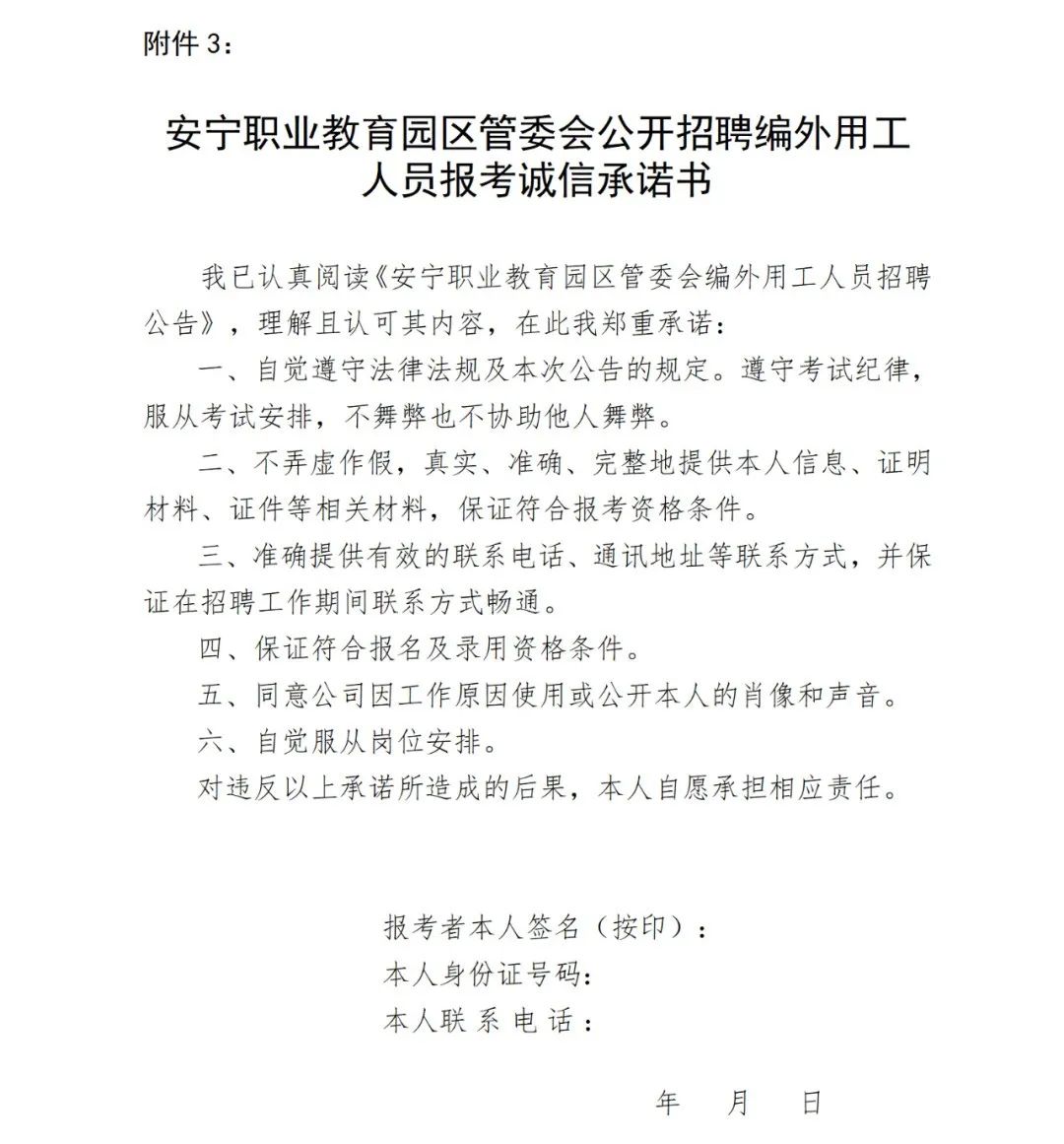 3.安寧職業(yè)教育園區(qū)管委會公開招聘編外用工人員報考誠信承諾書