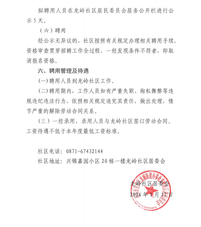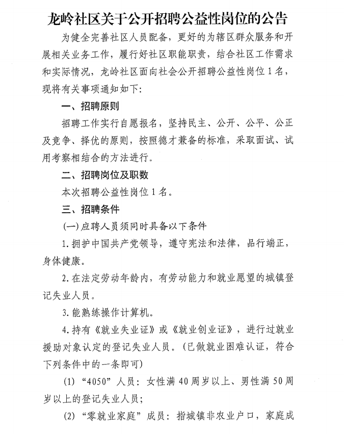 【社區(qū)招聘】龍嶺社區(qū)關(guān)于公開招聘公益性崗位的公告