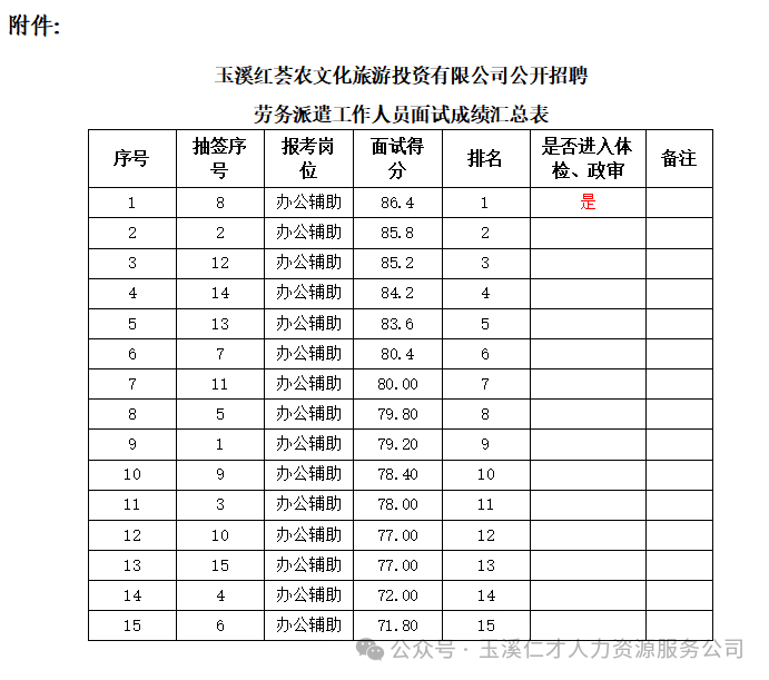 勞務(wù)派遣工作人員面試成績(jī)公示