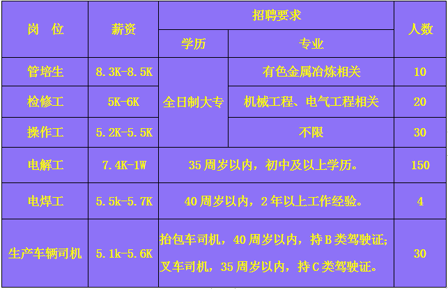 1、試用期三個(gè)月,電解工的試用期工資4000-5000元/月。其他崗位試用期執(zhí)行工資的80%。