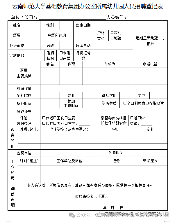 應(yīng)聘者按照招聘條件和要求,持自己的求職材料:《云南師范大學(xué)基教集團辦公室所屬幼兒園人員招聘登記表》及自薦書、簡歷、身份證等原件、復(fù)印件和有關(guān)證明材料,前往昆明市呈貢新區(qū)七彩云南第一城云南師范大學(xué)附屬七彩云南幼兒園1樓保安值班室報名(周末、節(jié)假日不休息)。