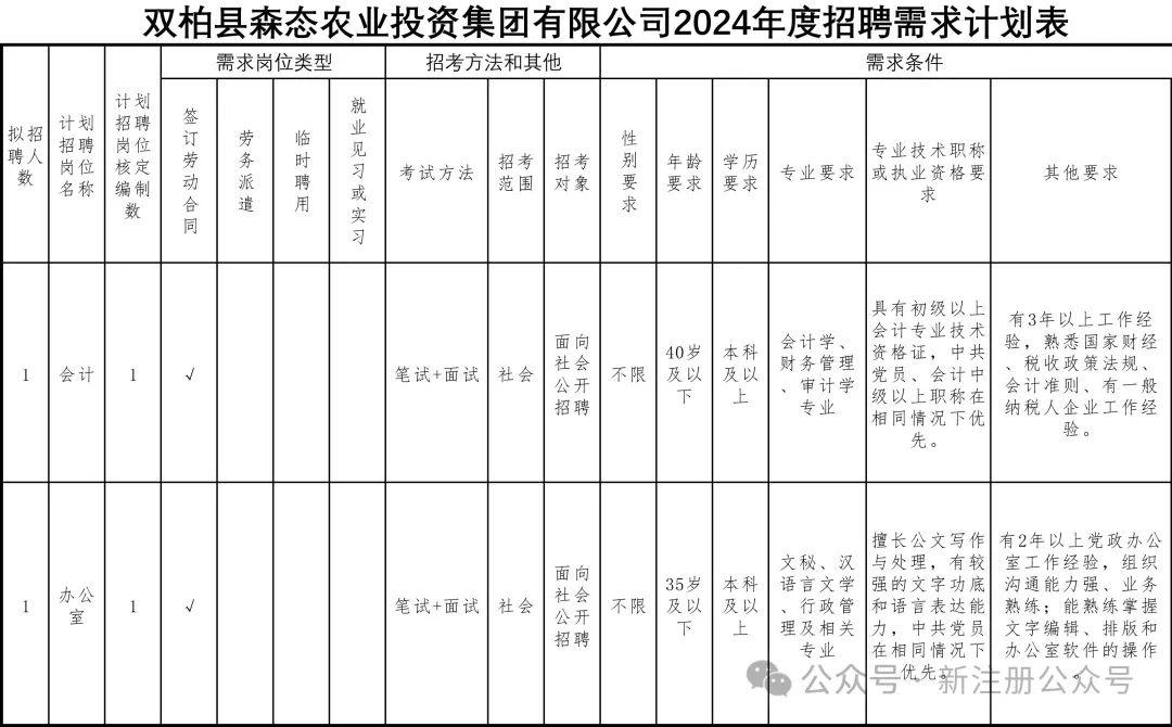 附件:雙柏縣森態(tài)農(nóng)業(yè)投資集團有限公司公司2024年度招聘計劃表
